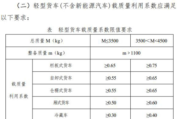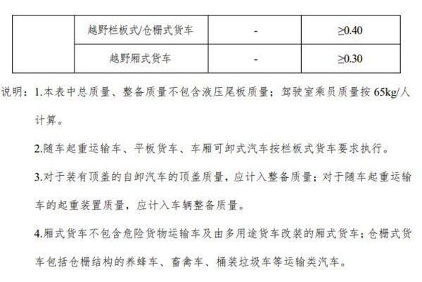 對載質(zhì)量系數(shù)的要求中包含很多專用車型,其中隨車起重運輸車、平板貨車、車廂可卸式汽車按欄板式貨車要求執(zhí)行;對于裝有頂蓋的自卸汽車的頂蓋質(zhì)量,應(yīng)計入整備質(zhì)量,對于隨車起重運輸車的起重裝置質(zhì)量,應(yīng)計入車輛整備質(zhì)量;廂式貨車不包含貨物運輸車及由多用途貨車改裝的廂式貨車,倉柵式貨車包括倉柵結(jié)構(gòu)的養(yǎng)蜂車、畜禽車、桶裝垃圾車等運輸類汽車。
