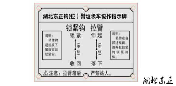 在勾臂式垃圾車裝載垃圾前,空載運(yùn)轉(zhuǎn)達(dá)到 6 個(gè)標(biāo)準(zhǔn)氣壓時(shí),掛上取力器(駕駛室內(nèi)方向盤左下方), 檢查各部件有無泄漏或異常后,再按照操作指示牌指示位置進(jìn)行操作; 操作手柄指示牌如圖: