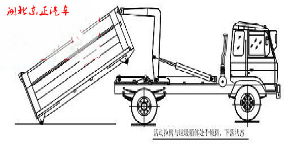 步驟 9. 垃圾箱放置好后,調(diào)整活動(dòng)拉臂鉤與箱體彎鉤位置,使其脫鉤,將拉臂操作手柄推下到落下位置,拉臂油缸收回,活動(dòng)拉臂繞翻轉(zhuǎn)翻轉(zhuǎn)架前鉸鏈軸旋轉(zhuǎn),活動(dòng)拉臂放回到附 車架上,松開取力器垃圾箱放置完成,整車可以運(yùn)輸行駛;