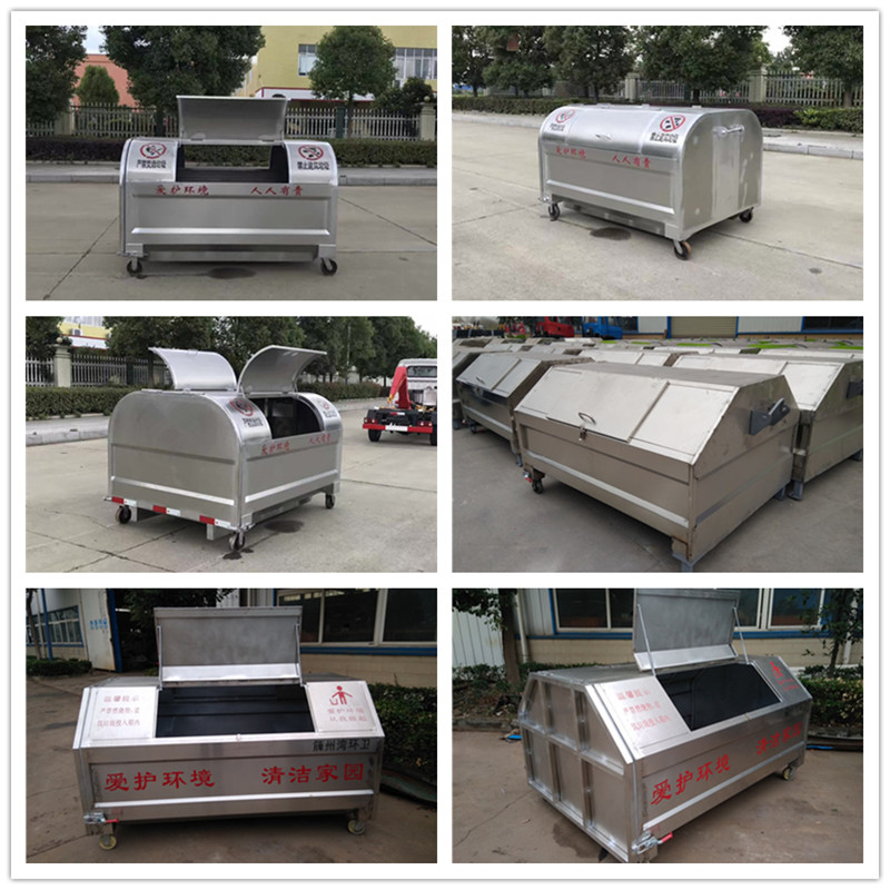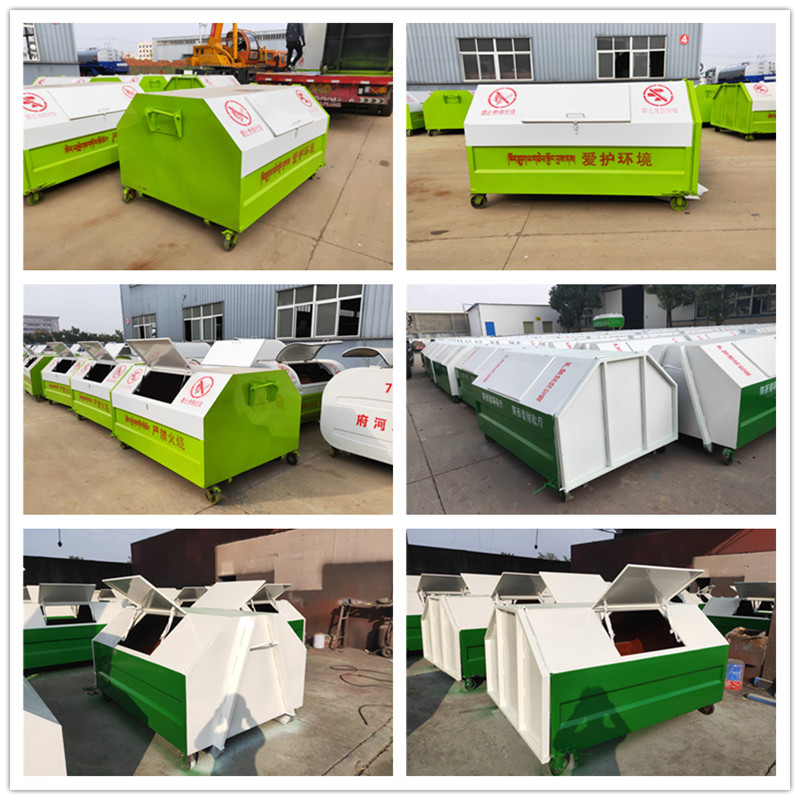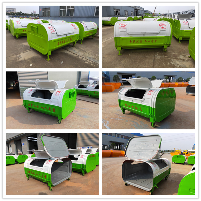 勾臂垃圾車配套移動垃圾箱外形以上梯形下長方形、上弧形下長方形、上弧形下弧形、長方形為主,箱體兩邊各帶一對或二對垃圾投入口或頂部開口,帶蓋式箱體能夠避免風將輕質(zhì)垃圾(塑料袋,廢紙等)吹散和防止雨水進入箱內(nèi);箱體底部帶一對鐵輪方便吊上卸下時垃圾箱的移動,箱體后部可開啟【帶鎖緊機構(gòu),配備密封條】。勾臂垃圾箱外觀形狀、大小容積可根據(jù)用戶需求定制加工。