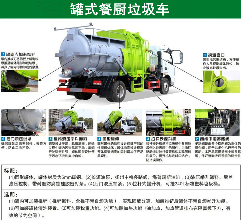 方罐式餐廚垃圾車:弧形廂體,箱體內(nèi)可實現(xiàn)固液分離,推鏟卸料,后蓋液壓開啟/鎖緊(帶耐磨橡膠密封條密封-后門關(guān)閉后滴水不漏),后門液壓鎖緊防誤操作功能,掛桶式提升機,可配合120升、240升標(biāo)準(zhǔn)垃圾桶使用,清洗裝置(帶水箱、液壓馬達(dá)帶動高壓泵)。